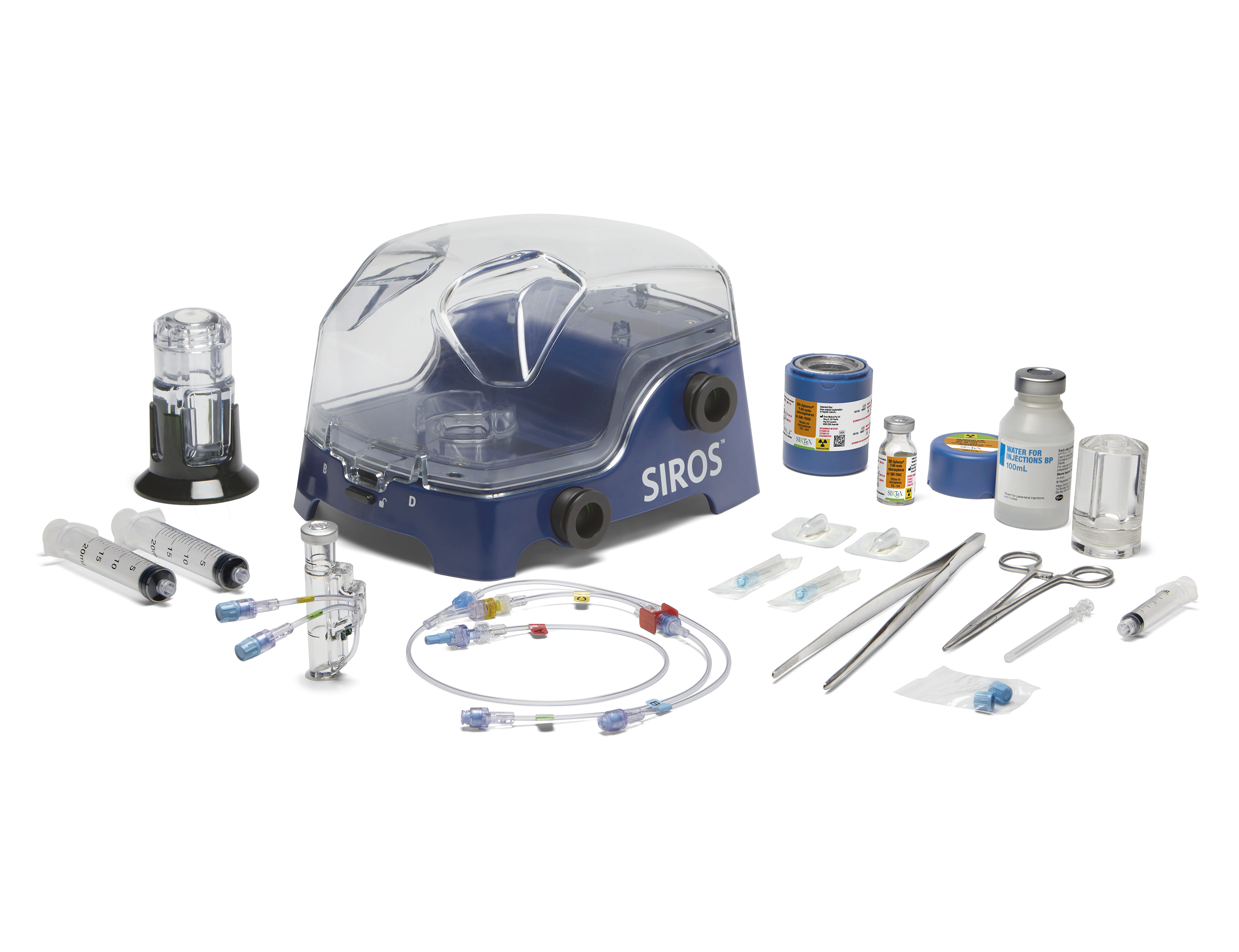 Representation of full delivery set with SIROS of SIR-Spheres® Y-90 resin microspheres and administration tools.